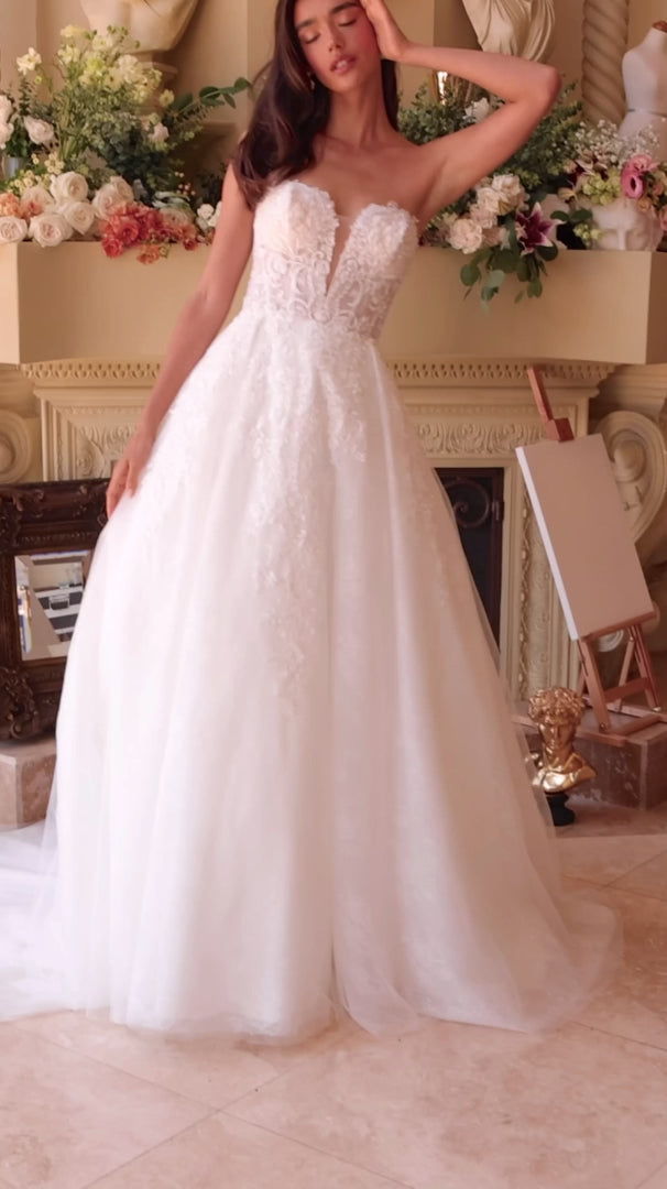 Step into elegance with this strapless ball gown featuring a deep sweetheart neckline and a stunning lace appliqué bodice. Crafted from layered tulle and lace, this gown showcases a structured bodice for enhanced support, ensuring you feel as beautiful as you look. The removable long sleeve bolero adds versatility, making it the perfect choice for a wedding dress or bridal gown.