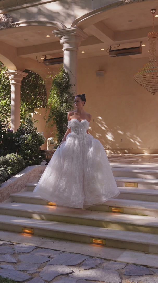 A fairytale moment for the modern bride. This romantic ball gown showcases an ethereal blend of elegance and structure with its off-the-shoulder neckline, softly ruched tulle, and delicately scattered floral appliqué. The sheer corset bodice with visible boning sculpts the figure while layers of embroidered tulle cascade into a voluminous skirt, bringing graceful movement and bridal magic. Whether for a garden ceremony or classic chapel vows, this gown captures the essence of timeless bridal beauty.